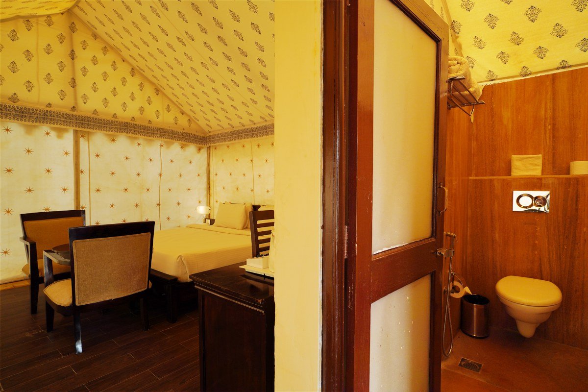 A stay in the Regal Tent is more than just accommodation – it’s about living the desert dream in style. Wake up to mesmerizing views of golden sand dunes, spend your day exploring the Thar Desert with camel safari or jeep safari, and return to evenings filled with cultural music, Kalbeliya dance, and a warm bonfire. As night falls, relax under the open desert sky and indulge in a stargazing experience in Jaisalmer that words can hardly describe.